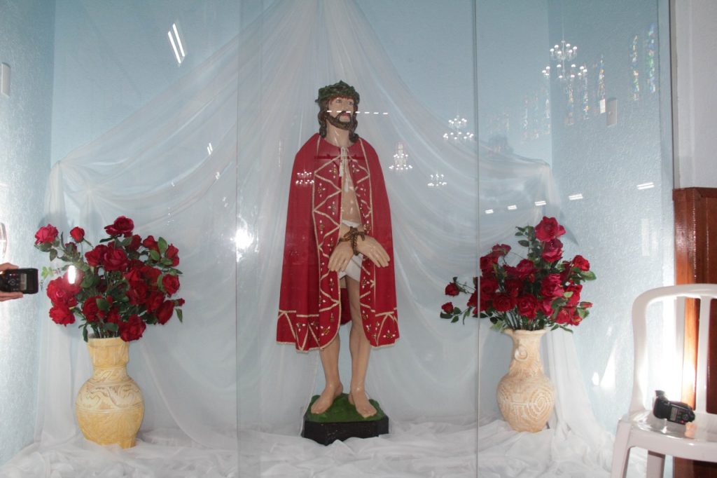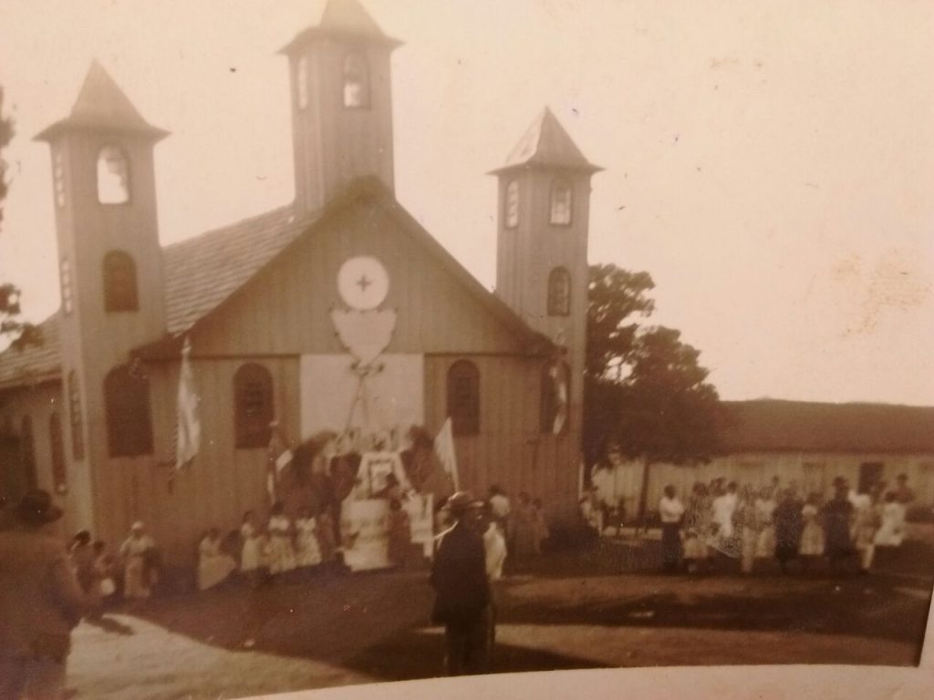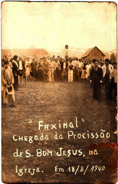 Como ninguém tinha uma imagem de porte, para ceder para a localidade, naquele momento, seu Adelino Proença – Pioneiro local – prontificou-se a trazer de São Paulo, no lombo de mulas, no prazo de 40 dias, uma imagem de São Bom Jesus. Dentro desse período, uma pequena igreja de madeira, foi levantada no local, no centro do povoado. Seu Adelino Proença, com muitas dificuldades, na viagem de volta de São Paulo, com chuvas e interrupções, não conseguiu chegar a tempo, dentro dos 40 dias. O Bispo voltou a Faxinal e fez novamente a indagação se haviam providenciado a imagem para deixá-la instituída como padroeiro do povoado. A imagem que um antigo morador apresentou foi a de São Sebastião. Cerca de 10 a 20 dias depois, seu Adelino Proença conseguiu chegar de São Paulo, trazendo a imagem de São Bom Jesus – como a de Iguape/SP – acompanhado de um escultor, que fez a montagem, ao lado da imagem de São Sebastião. A imagem de São Bom Jesus foi recebida, com procissão e grande festa, conforme aparece na foto com a primeira igreja de madeira ao fundo, de 1940.