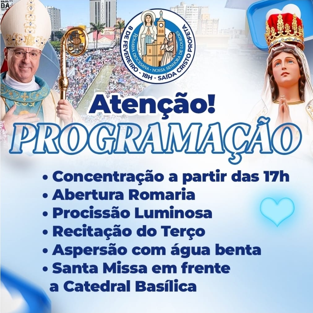 A Diocese de Apucarana/PR, chama a todos para a 7ª. Romaria Diocesana – em louvor à Padroeira Nossa Senhora de Lourdes – neste dia 08/02/2026, a partir das 17h. A concentração inicial se dará em frente a Paróquia Cristo Profeta, número 344, seguindo pela BR 369; Barra Funda, ao lado do Ginásio de Esportes Lagoão de Apucarana. As fotos abaixo, mostram o roteiro a ser percorrida pela procissão, saindo da Paróquia Cristo Profeta até a Catedral, Basílica Menor de Nossa Senhora de Lourdes.